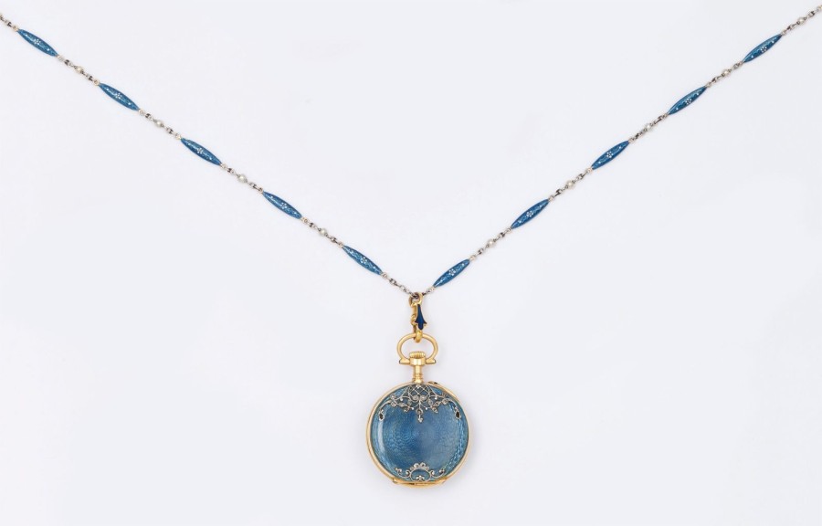 Watch collar and chain enamelled blue yellow and white gold adorned with pearls and rose-cut diamonds. 1900