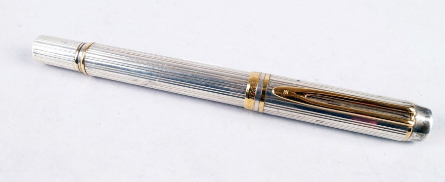 STYLO PLUME godronné modèle Ideal en argent et plaqué or vers 1990. Plume or 18 ct. Porte le n° 2204. H.: 14,3 cm
