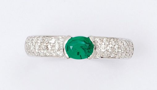 White gold ring ring set with an oval emerald shoulder paving brilliant-cut diamonds. Ring size: 58. P. 3.8 g.