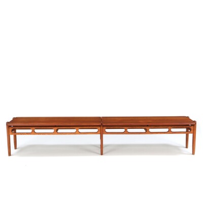Teak and oak wall system with six legs, loose top with eight adjustable shelves