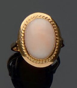Yellow gold ring, 750 MM, adorned with a coral "angel skin", size: 51, weight: 4,3gr. gross