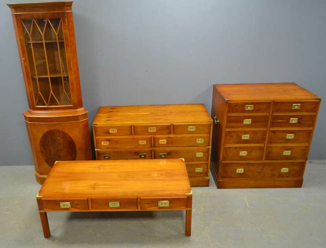 coffee table with three drawers, cabinet with hinged lid over two cupboard doors and a yew corner cabinet