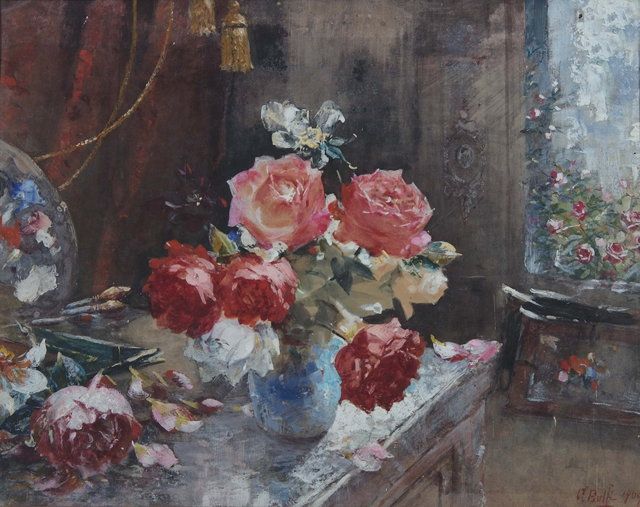 Still life - a blue vase of roses upon a table in a room setting