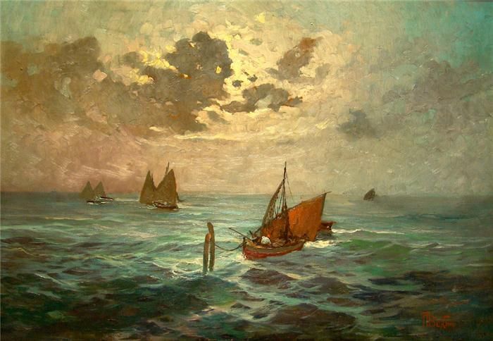 Südländische Fischerboote auf offener See in der Dämmerung.