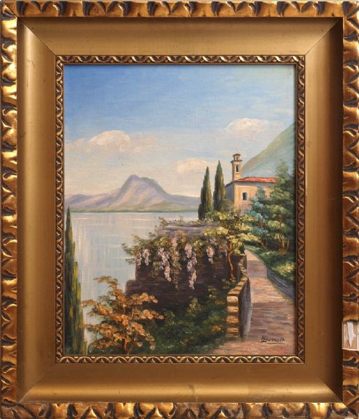 Sommerliche Uferpartie am Luganer See, im Hintergrund die Höhenzüge der Alpen