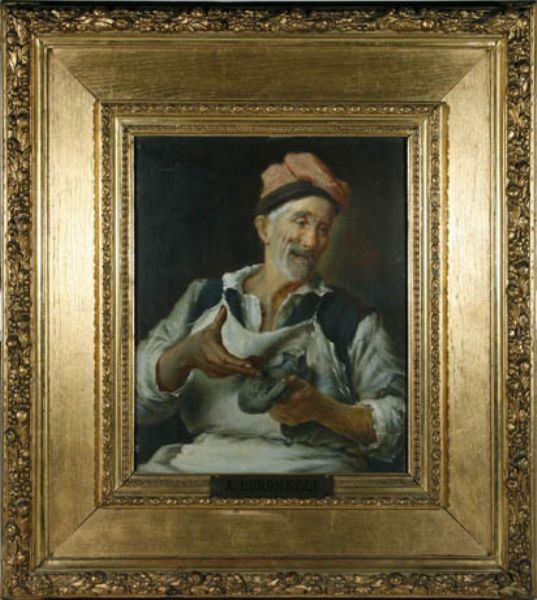 | Dreiviertelportrait eines alten Schuhmachers, in den Händen eine zerlöcherte Stiefelette haltend | |