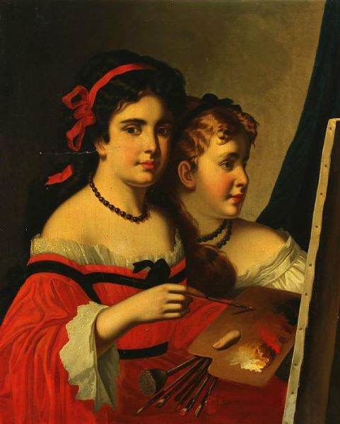 Two young girls at a painting.
