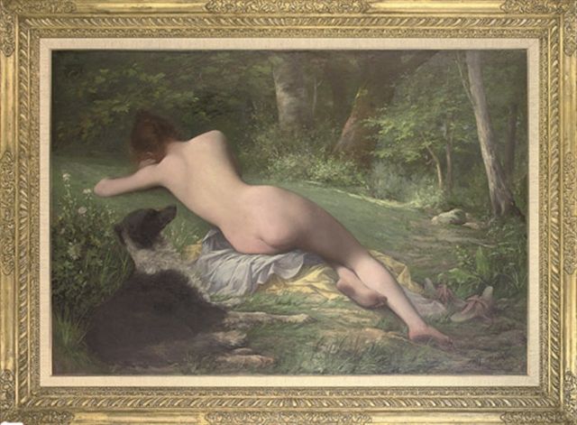 Femme nu etendue dans un paysage avec un chien