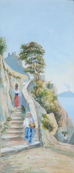 Bauersleute, die eine Treppe hinabsteigen, im Hintergrund der Vesuv und Blick