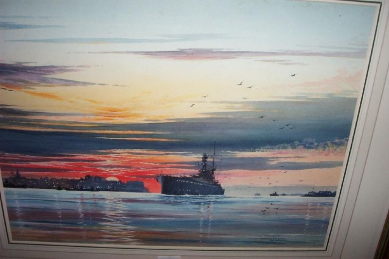 HM Ship Repulse entering Portsmouth Harbour at sunset
