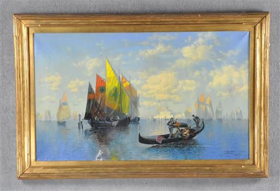 Venice with gondolier and sailboats. San Marco in rear center waterline