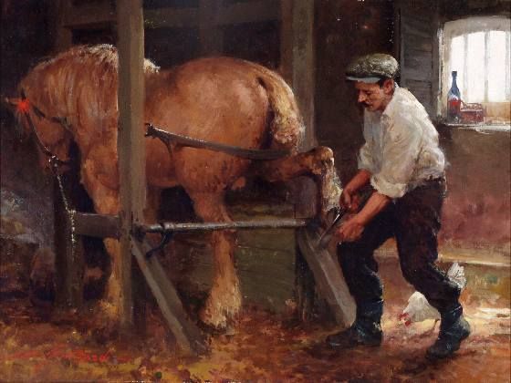Pferdestall, Bauer bei der Hufpflege seines Arbeitspferdes