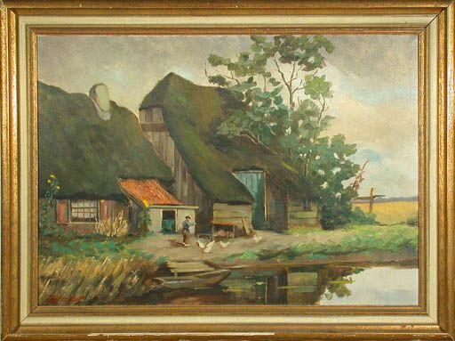 Ansicht eines reetgedeckten Bauerngehöfts am Flußufer mit Figurenstaffage und Tieren.