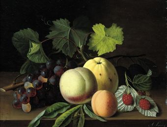An apple, peaches, raspberries, plums and grapes on a ledge