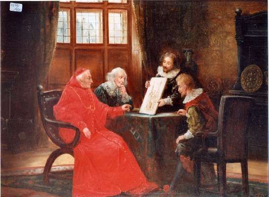Der Dombaumeister - Interieur mit Personen und u.a. Kardinal bei der Besprechung