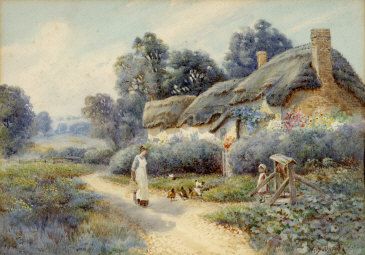 a landscape with a young woman and child feeding chickens in front of a thatched cottage