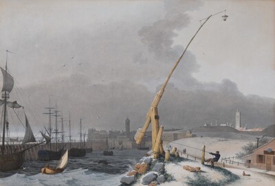 A PORT IN WINTER WITH A MAN RAISING A LANTERN