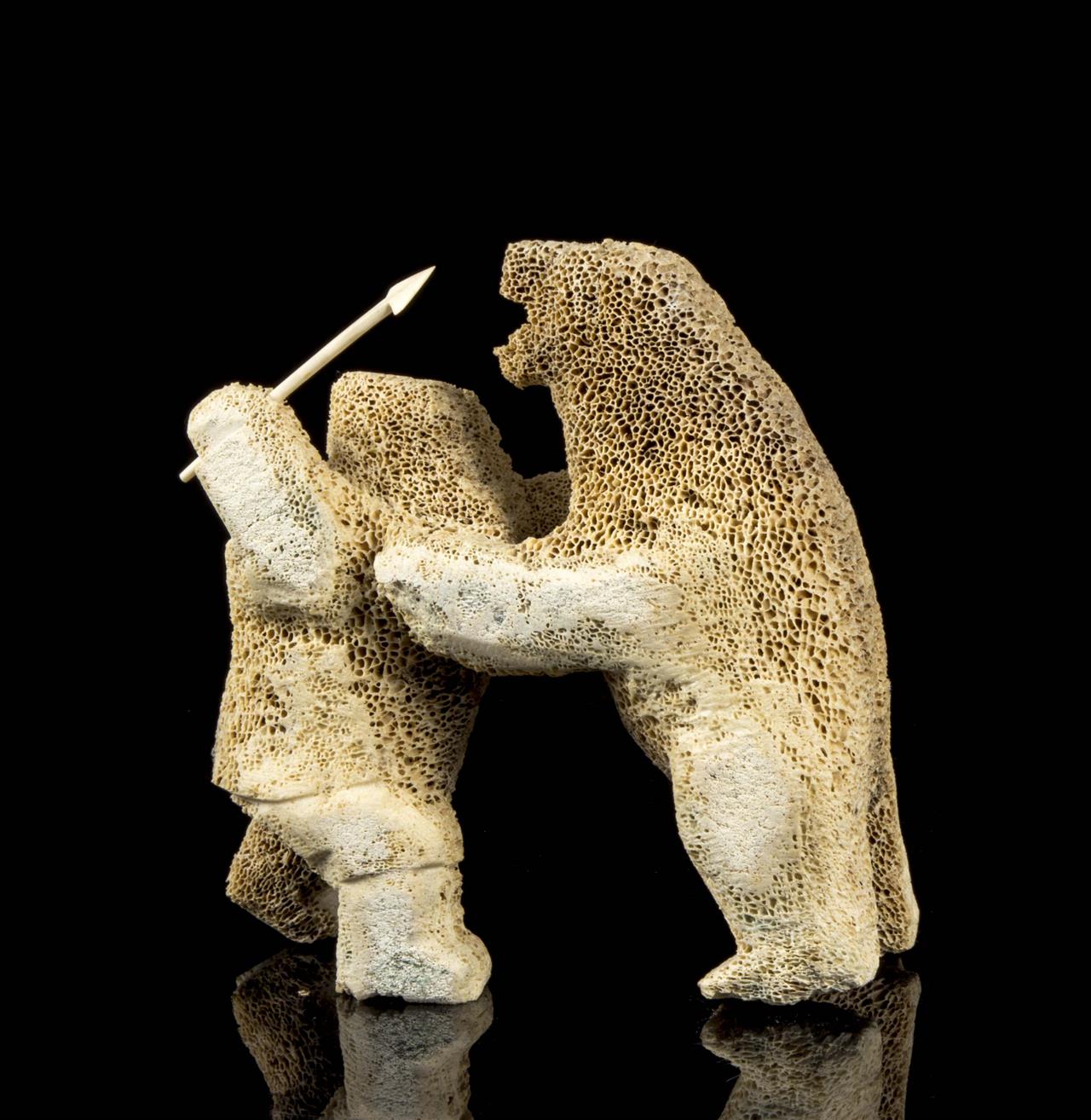 | a whale bone carving of a hunter battling a polar bear | |