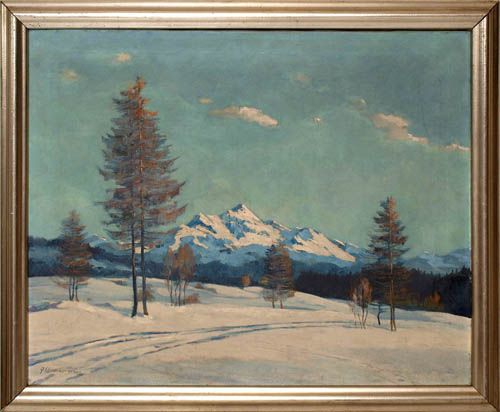 | Winterliche Voralpenlandschaft, im Vordergrund eine Fahrspur durch den Schnee zwischen einzelnen Bäumen | |