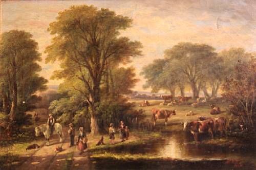 A rural landscape with cattle watering and figures along a track