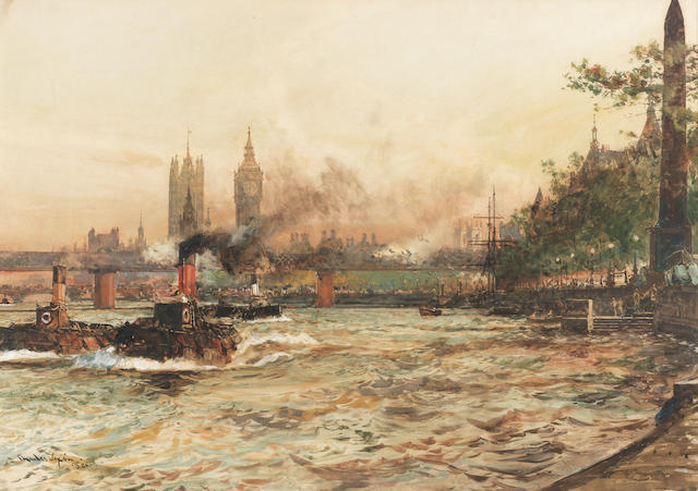 | A view on the Thames by Cleopatra's Needle with Westminster beyond | |