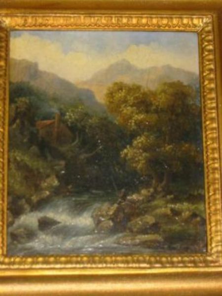 | A Welsh River Landscape with Angler and distant Mountains | |