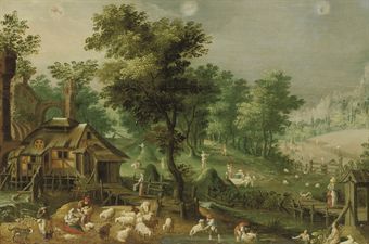 | An Allegory of Summer with three Signs of the Zodiac: A wooded landscape with peasants shearing sheep and harvesting corn | |