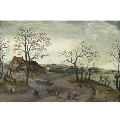 | AUTUMN: A RIVER LANDSCAPE WITH PEASANTS AND WOODCUTTERS ON A ROAD NEAR A VILLAGE | |
