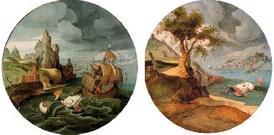 Jonas thrown in the water; and Jonas and the whale
