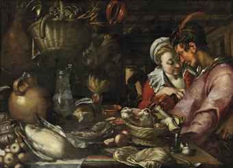| A kitchen still life with a couple standing beside a table with an elaborate display of meat, fish, vegetables and fruit | |