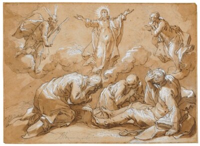 | Chalk pen and brown ink and brown wash, heightened with white (de-oxidized), black chalk framing lines, watermark crozier in shield | |