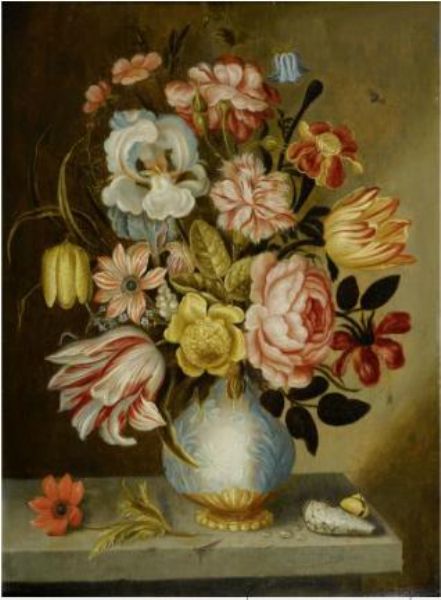 | Still life of flowers in a vase on a stone plinth with shells and small insects | |