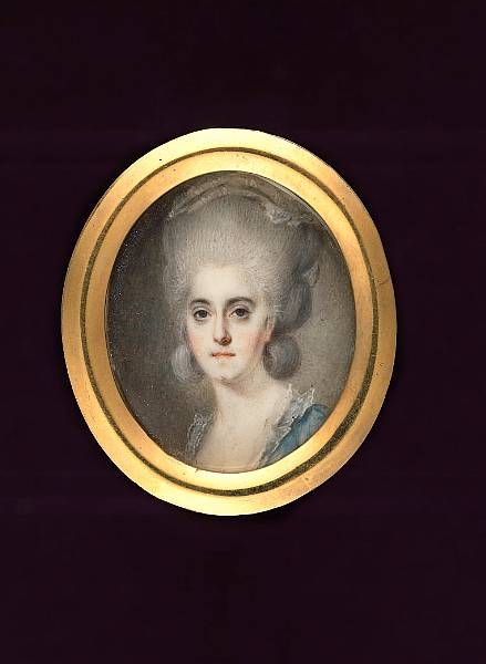 A Lady, wearing blue dress with lace frilled neckline and a white kerchief over her powdered hair.