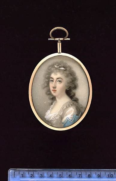 | A Lady, wearing white dress with pale blue sleeve and lace collar, strand of pearls over her shoulder, further pearls and white | |