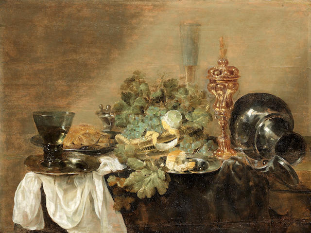 | Grapes and a peeled lemon in a basket with bread, dressed crab and a roemer of wine on pewter plates, together with a gilt cup a | |
