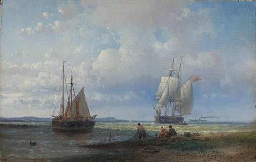 | Fishermen mending their nets on the beach, a trading brig standing out to sea and a steamer beyond | |