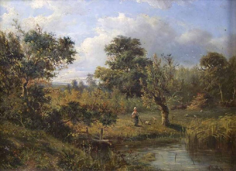 Landscape with Figures and Chickens by a Pond, and a Figure drying Clothes in a Field