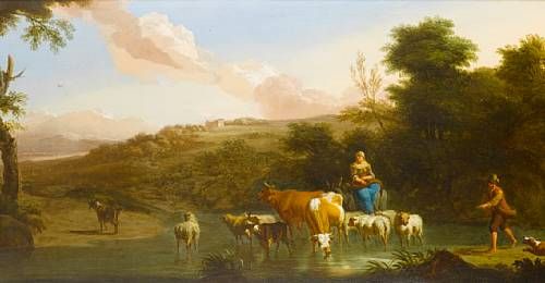 | Shepherds grazing their cattle before an open Italianate landscape | |