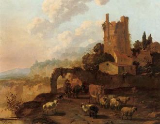 | An Italianate landscape with a herdsman and his flock passing by a ruined building | |