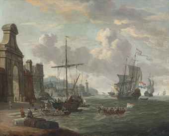 | A Mediterranean harbour with stevedores loading ships by a city gate, a Dutch man-of-war and other shipping beyond | |