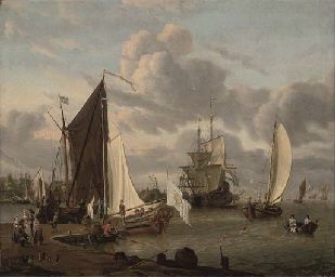 | A port with smalschips and a man-o'-war, with fisherfolk and elegant company | |
