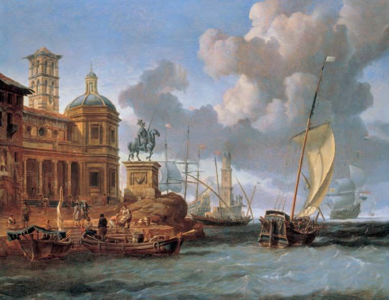 MITTELMEERHAFEN MIT PALAST UND REITERSTANDBILD