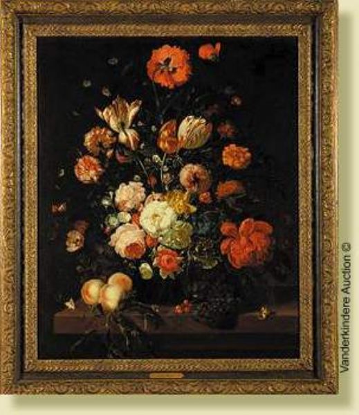 Bouquet de fleurs et de fruits avec insectes sur un entablement