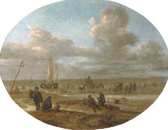 | Fishermen trading on a beach with a sailing vessel in rough waters beyond | |