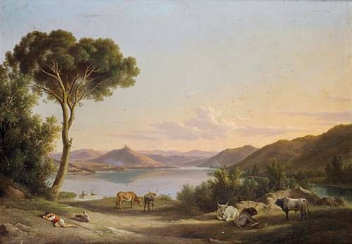| An Italian lake landscape with cattle resting in the foreground; An Italian landscape | |
