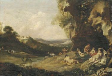 | An extensive mountainous landscape with nymphs on a bank, a classical dwelling beyond | |