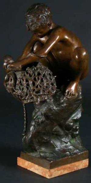 A Bronze Boy; squatting upon a rock with a fishing basket & octopus