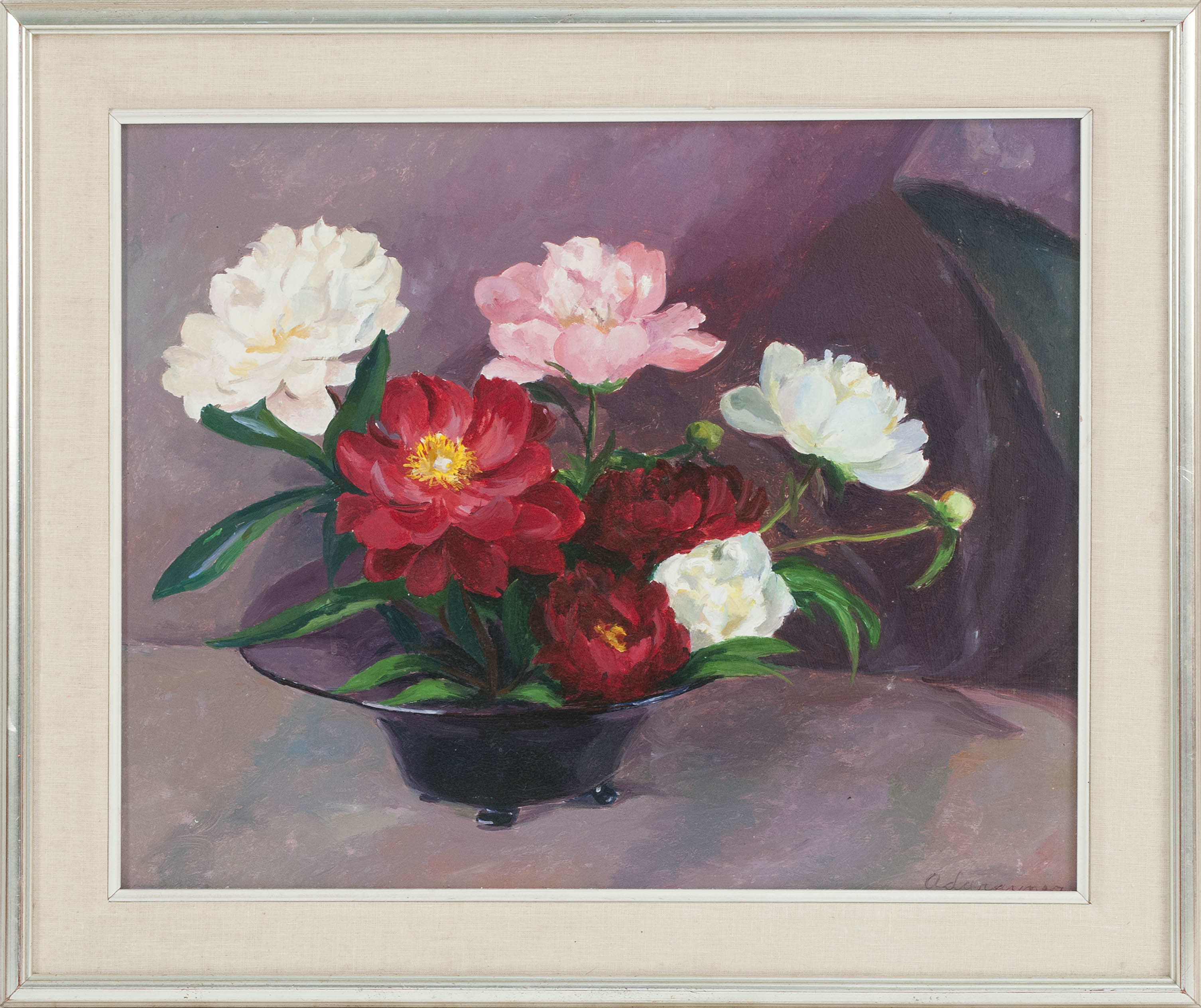 Still life of peonies in an amethyst glass bowl