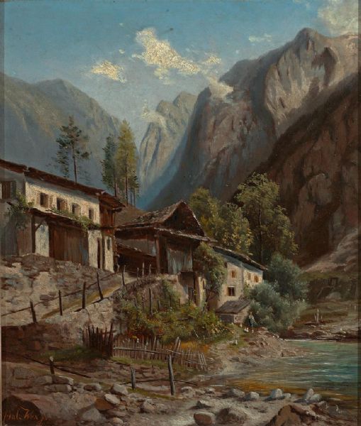 Malerische Gebirgslandschaft mit Gehöften an einem Bach.