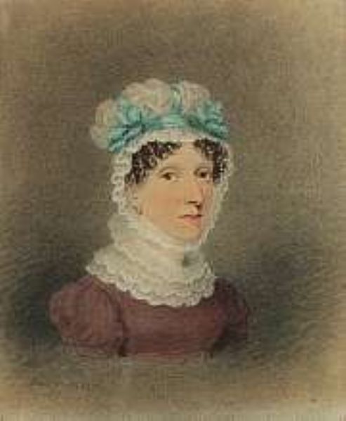 | A Lady, wearing plum-coloured dress, white lace layered collar and white bonnet decorated with blue ribbon | |
